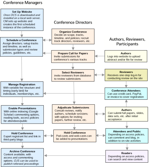 OCS is flexible and scalable. A single installation of OCS can support the operation of multiple conferences, and multiple years for each conference. Each conference has its own unique URL as well as its own look and feel. OCS can enable a single director to manage all aspects of a conference, or OCS will support an international team of people with diverse responsibilities for a conference's various aspects.